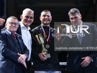 KRAKOW, POLAND - DECEMBER 14 : Oskar Eliezer Davids Chananya of Israel (2R) was named the best senior, poses for a photo with Andrzej Golota (R), a Polish former professional boxer and as an amateur won a Heavyweight bronze medal at the 1988 Olympics and Wojciech Bartnik (2L), who won a Light Heavyweight bronze medal at the 1992 Olympics, and Artur Kowalski, the tournament directorat and son of the event's founder Teofil Kowalski, a former boxer, coach of many generations of fighters, in Krakow, Poland, on December 14, 2024.