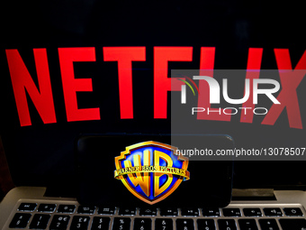 In this photo illustration the Warner Bros Pictures logo is shown on a mobile phone against the Netflix website displayed on a computer screen as the online entertainment company purchese the historic production studio - December 9, 2025.