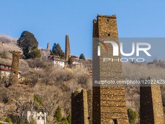 A photo taken on February 4, 2025, shows the thousand-year-old Suopo Tibetan villages Ancient Stone Watchtower Complex in Danba County, Ganzi Prefecture, Sichuan Province, China.