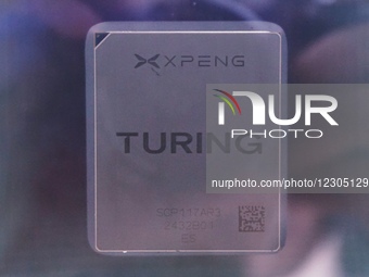 The Xiaopeng Turing AI chip showcases at the 2025 Shanghai Auto Show in Shanghai, China, on April 23, 2025.