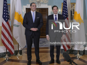 US Department of State Secretary Marco Rubio and Republic of Cyprus Foreign Minister Constantinos Kombos hold a Spray Photo Opp before a bilateral meeting in Washington DC, USA, on November 17, 2025, at the Treaty Room/DOS.