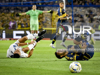 In Buenos Aires, Argentina, on November 23, 2025, Carlos Palacios (left), Ulises Ortegoza (center), and Leandro Paredes (right) fight for the ball in the match between Boca Juniors and Talleres de Cordoba. In the round of 16 of Torneo Clausura Betano 2025, Boca Juniors beats Talleres 2-0 at Alberto J Armando, La Bombonera Stadium.