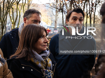 Christophe Rosa, Director of Parks and Environment (DEVE), stands next to Anne Hidalgo, the Mayor of Paris, during the launch of the new tree planting season in the new urban forest at Place du Colonel Fabien, in Paris, France, on December 5, 2025.