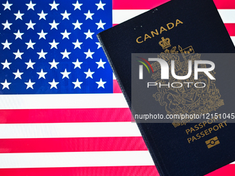 EDMONTON, CANADA - MARCH 12: A Canadian passport is displayed in front of a computer screen showing the American flag in Edmonton, Alberta, Canada, on March 12, 2025. The U.S. has announced new regulations requiring Canadians staying beyond 30 days to register their information and complete fingerprinting starting April 11, according to the rule published in the federal register today.