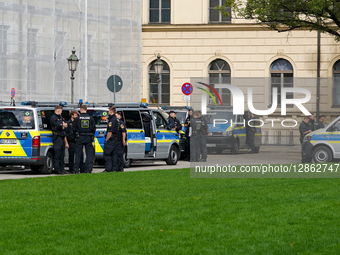 Bavarian police officers stand beside several police vans during an operation in Munich, Bavaria, Germany, on October 11, 2025.