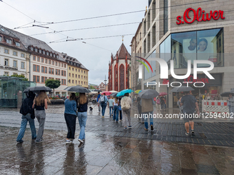 People with umbrellas walk past the s.Oliver fashion store in the city center during a rainy afternoon in Wuerzburg, Bavaria, Lower Franconia, Germany, on July 26, 2025.
