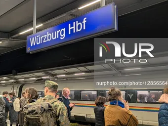 Travelers wait on the platform as a regional train and an ICE stand opposite each other at Wuerzburg Central Station in Wuerzburg, Bavaria, Lower Franconia, Germany, on October 12, 2025. Passengers, including a soldier, prepare to board evening trains operated by Deutsche Bahn.