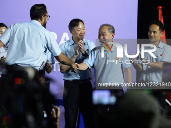 Former Workers' Party (WP) chief Low Thia Khiang shakes hands with Singapore opposition leader and Workers' Party (WP) Secretary-General, Pritam Singh, during their party night rally ahead of the general election in Singapore, on May 1, 2025.