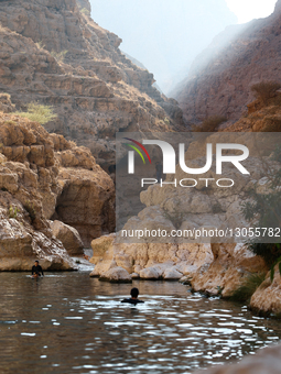 People swim at the Wadi Shab in Tiwi, Oman on December 3, 2025.