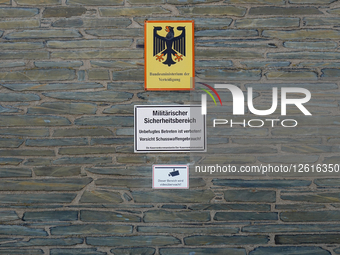 Wall signage with the federal eagle and entry warning marks the military security zone of the headquarters of the Federal Ministry of Defence (Bundesministerium der Verteidigung, BMVg) at the Hardthohe site in Bonn, North Rhine-Westphalia, Germany, on August 1, 2025. The BMVg is a federal ministry of the German government and part of the Cabinet of Germany, headquartered in Bonn.