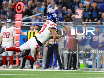 DETROIT,MICHIGAN-November23: Safety Thomas Harper (12) of the Detroit Lions intercepts the ball during an NFL football game between the New York Giants and the Detroit Lions in Detroit, Michigan USA, on Sunday, November 23, 2025.