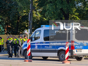 Police and security forces monitor entrances as visitors return to Oktoberfest after the festival grounds reopen at 5:30 p.m. following a bomb threat in Munich, Bavaria, Germany, on October 1, 2025. Tight security checks and restricted access are in place as crowds re-enter the event.