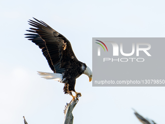 A bald eagle lands on a tree at Orlando Wetlands in Christmas, Florida, on December 9, 2025. Bald eagles build some of the largest nests of any bird species, with the heaviest recorded nests weighing close to a ton. They typically fly around 30-40 miles per hour and can dive at speeds reaching 75-100 miles per hour when hunting.