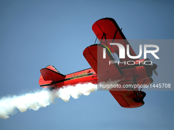 Wingwalker Danielle Hughes performing in Athens Flying Week 2016, Tanagra, Greece, 18 Sep, 2016. Athens Flying Week is the city’s international aviation event and it has been characterized as one of the biggest and most successful aviation events in South East Europe. It provides a unique show conducted by top aviation teams from around the world, who demonstrate their flying skills by operating their state-of-the-art aircrafts across the Athenian sky.