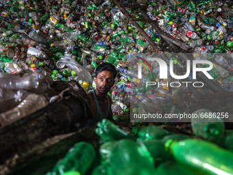Woman laborers sort through polyethylene terephthalate (PET) bottles in a recycling factory in Dhaka, Bangladesh, on August 12, 2020. Recycling plastic bottles has become a growing business over the last couple of years as well as helping to protect the environment. According to the Bangladesh PET Flakes Manufacturers and Exporters Association (BPFMEA), Bangladesh exports on an average nearly 30,000 tons of PET bottle flakes mainly to China, South Korea and Taiwan worth $14 million dollars per year.