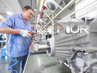 A worker produces a batch of scroll air compressor products for export to Canada at the production workshop of Zhejiang Gaoling New Energy Technology Co., LTD., located in Moganshan High-tech Zone in Huzhou, Zhejiang province, China, on September 20, 2024.