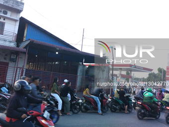 A lengthy line of vehicles, predominantly motorcycles, queues outside a gas station (SPBU) in North Sumatra, Indonesia, on november 30, 2025. The crisis, occurring three days after a devastating hydrometeorological disaster, severely hampers the regional fuel supply chain. Distribution delays, coupled with a surge in demand from affected communities and fear-driven panic buying, create widespread shortages. Authorities address allegations of illegal fuel hoarding that exploits the post-disaster hardship and makes recovery difficult for local residents.