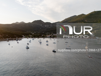 Drone view of yachts and sailboats anchored in the bay of Parga, Greece on September 3, 2025.