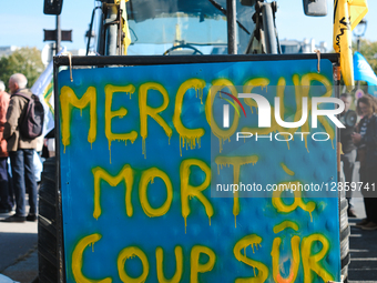 A tractor bears the slogan ''Mercosur is sure to die'' from the Confederation Paysanne, two of whose activists are on trial for violence against law enforcement as part of a fight against MERCOSUR.