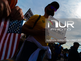 A person displays a sign reading ''Him Up!'' attached with a lock during the ''No Kings'' protest in Rochester, New York. Protesters gather during the ''No Kings'' demonstration in Rochester, New York, on October 18, 2025, calling for the end of monarchic systems and advocating for equality and people's rule. The rally includes speeches, signs, and chants criticizing inherited power and colonial legacies. The event is part of a series of local actions echoing global calls for justice and self-determination.