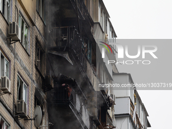Smoke rises from burnt-out balconies in an apartment block in the Darnytskyi district damaged by a Russian missile and drone strike in Kyiv, Ukraine, on November 29, 2025.