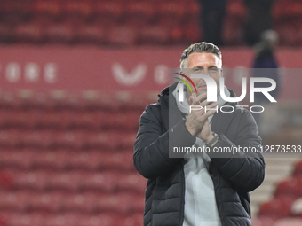 Rob Edwards, the Middlesbrough Manager, applauds and celebrates the win with the fans at the final whistle at the Sky Bet Championship match between Middlesbrough and Ipswich Town at the Riverside Stadium in Middlesbrough, England, on October 17, 2025.