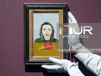 LONDON, UNITED KINGDOM - SEPTEMBER 23, 2025: An art handler holds a painting by Lucian Freud titled "Woman with a Tulip" (1944) - estimate: £3,000,000-5,000,000 during a photocall at Christie's auction house ahead of 20th/21st Century: London Evening Sale in London, United Kingdom on September 23, 2025.