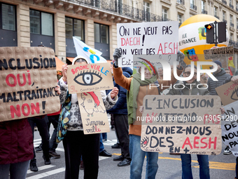 Protesters hold placards about the need for support staff for students with disabilities (AESH) during a demonstration as part of a call by trade unions for strikes and demonstrations for higher wages and against austerity in Paris, France, on December 2, 2025.
