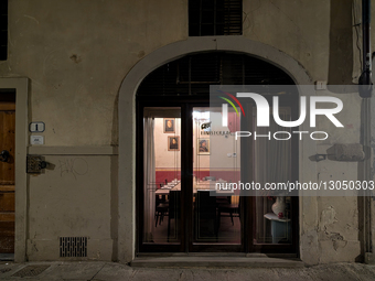Diners sit inside the Finisterrae Restaurant, visible through a historic arched doorway in Florence, Italy, on November 21, 2025. The illuminated scene captures the interior atmosphere of Tuscan dining, reflecting the local business and economic food trade in the evening city life in the Tuscan city of Florence.