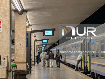 Passengers walk and board a train at the Firenze Santa Maria Novella train station platform in Florence, Tuscany, Italy, on November 21, 2025. The scene captures public transport and mobility essential to daily life in the Tuscan city of Florence, reflecting the transportation system.