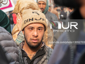 Members of the All Jammu and Kashmir Handicapped Association (JKHA) are seen during a protest to mark the International Day of People with Disabilities in Srinagar, on December 3, 2025. The protesting members of AJKHA demand better living conditions and rights. The International Day of People with Disabilities is observed on December 3 every year.