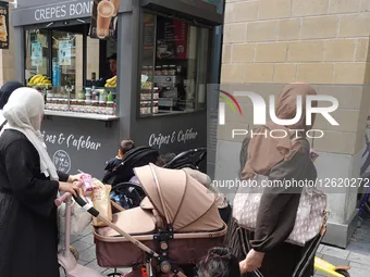 Women with baby strollers stop in front of a mobile crepe and coffee bar in a pedestrian zone in Bonn, North Rhine-Westphalia, Germany, on August 1, 2025.