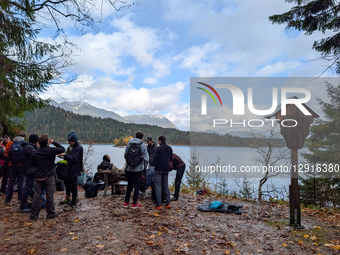 A large group of hikers rests and gathers around a wooden bench on a small clearing along the Eibsee Circular Trail, overlooking Lake Eibsee and the snow-dusted Wetterstein Mountains under a cloudy sky in Grainau, Garmisch-Partenkirchen, Bavaria, Germany, on October 26, 2025.