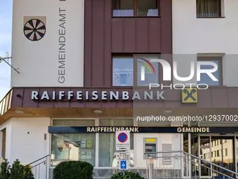 The sign for Raiffeisenbank is displayed at the bank branch in Biberwier, Tyrol, Austria, on November 1, 2025. The scene features the Gable Cross logo and a view of the snow-capped Tyrolean Alps towering over the valley.
