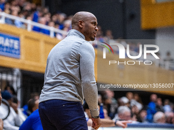Patrick Sellers, the head coach of the Central Connecticut State Blue Devils, reacts during an NCAA men's basketball game at Walsh Gymnasium in South Orange, United States, on December 3, 2025