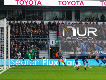 Jacob Widell Zetterstrom of Derby County is beaten by the shot from Oliver Skipp of Leicester City during the Sky Bet Championship match between Derby County and Leicester City at Pride Park in Derby, England, on December 6, 2025.