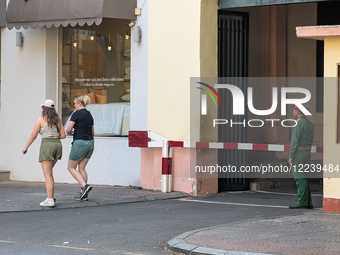 Two foreign visitors pass by a uniformed guard at a restricted entry point near a commercial building in Ho Chi Minh City, Vietnam, on April 6, 2025. The location features a security barrier next to a retail display advertising a luxury linen collection.