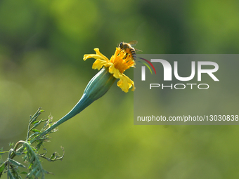 A honey bee collects flower nectar from a marigold flower in Siliguri, India, on November 27, 2025.