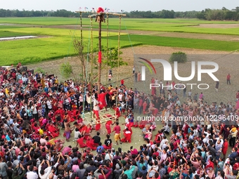 Thousands of devotees gather in Moulvibazar, Bangladesh, on April 14, 2025, to observe Charak Puja, a Hindu folk festival dedicated to Lord Shiva. Devotees pierce their backs with hooks and swing from tall structures in acts of intense devotion and penance, marking the Bengali New Year with spiritual zeal and centuries-old tradition.