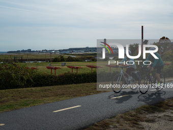 Bicyclists ride through Gravelly Point Park as planes taxi the runway at Ronald Reagan Washington National Airport in Arlington, Virginia on November 7, 2025. The Federal Aviation Administration announced an order on Friday to reduce air traffic at 40 of the busiest airports across the U.S. in an effort to maintain travel safety and ease pressure on air traffic controllers, who are working without pay.