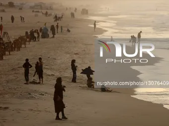 Palestinians spend their time on the Mediterranean coast during sunset in Gaza City, on December 8, 2025.