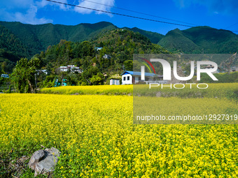 A scenic rural view of blossoming mustard farmland is in Bhardeu Village, Lalitpur, Nepal, on October 24, 2025