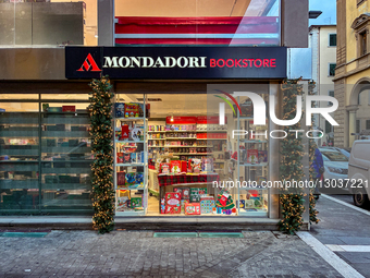 The storefront of a Mondadori Bookstore is visible from the street in Arezzo, Tuscany, Italy, on November 20, 2025, featuring its name and logo above large display windows showcasing books, gifts, and Christmas decorations. The entrance is flanked by columns wrapped in festive lights and garlands. The store promotes literature and reading culture, with shelves visibly stocked with fiction and non-fiction titles, appealing to book lovers and holiday shoppers.