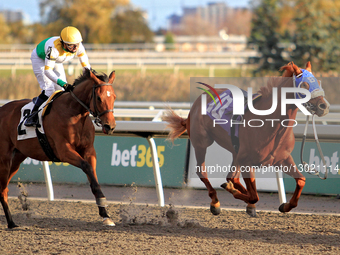 Jockey Rafael Hernandez and Yorktown's Legacy (2) follow the two-year-old chestnut colt Metro King after jockey Dane Nelson is dismounted as they cross the finish line in the sixth race at Woodbine Racetrack in Toronto, Canada, on November 23, 2025.
