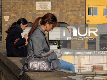 Two young women sit on a stone wall using their smartphones against the background of historic architecture in Florence, Tuscany, Italy, on November 21, 2025. The scene illustrates the intersection of modern technology and historic tourism, often seen among travelers from Generation Z.