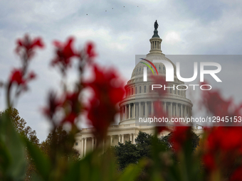 The dome of the U.S. Capitol building in Washington, D.C. is seen beyond flowers on November 3, 2025, the 33rd day of the U.S. government shutdown.
