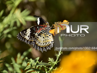 A plain tiger butterfly collects pollen and nectar from a flower in Nagaon District, Assam, India, on November 16, 2025.