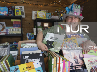 A bookseller with a butterfly hat is serving customers at her bookstore's stand inside the Santander Book Fair (FELISA), which is taking place in the Plaza Porticada of Santander, Spain, for 10 days in the month of July and is bringing together numerous writers, cartoonists, artists, and musicians within its extensive program of activities.