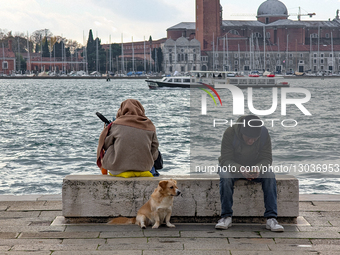 Two people sit on a low stone seawall or bench along the waterfront, with a small dog sitting between them, in Venice, Italy, on November 17, 2025. The person on the right looks intently at a smartphone.