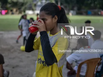 Tania, 13, drinks water during a break from football practice at a women's football academy in Nandail, Mymensingh, Bangladesh, on July 24, 2025. In this rural village, the grassroots academy run by Coach Uzzal does more than just train girls; it transforms lives. The program produces national-level players and offers girls a path out of poverty and social pressure while challenging traditional norms and early marriage.